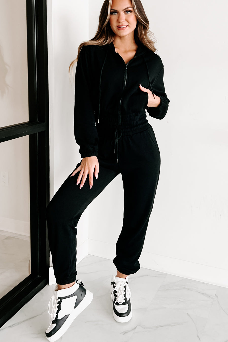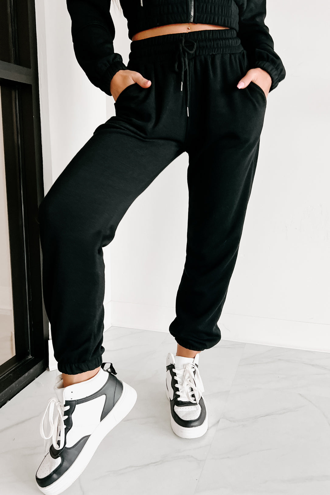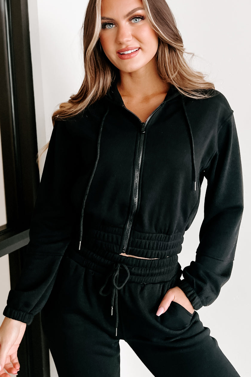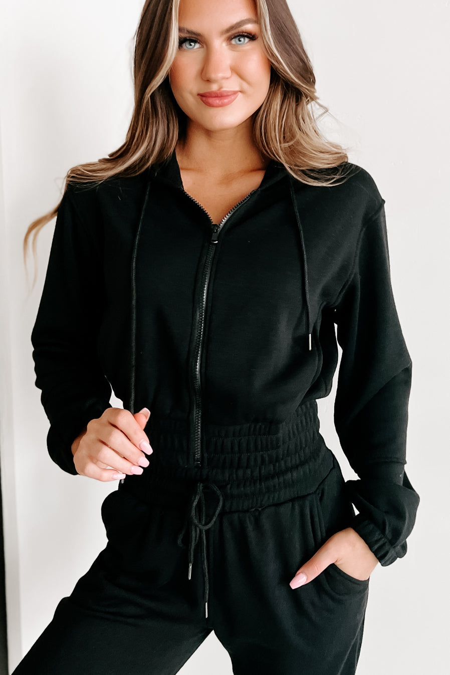 - Top: Drawstring Hood, Zipper Closure, Side Slit Pockets, Elastic Banded Hem, Fleece Lined, Slightly Cropped Fit